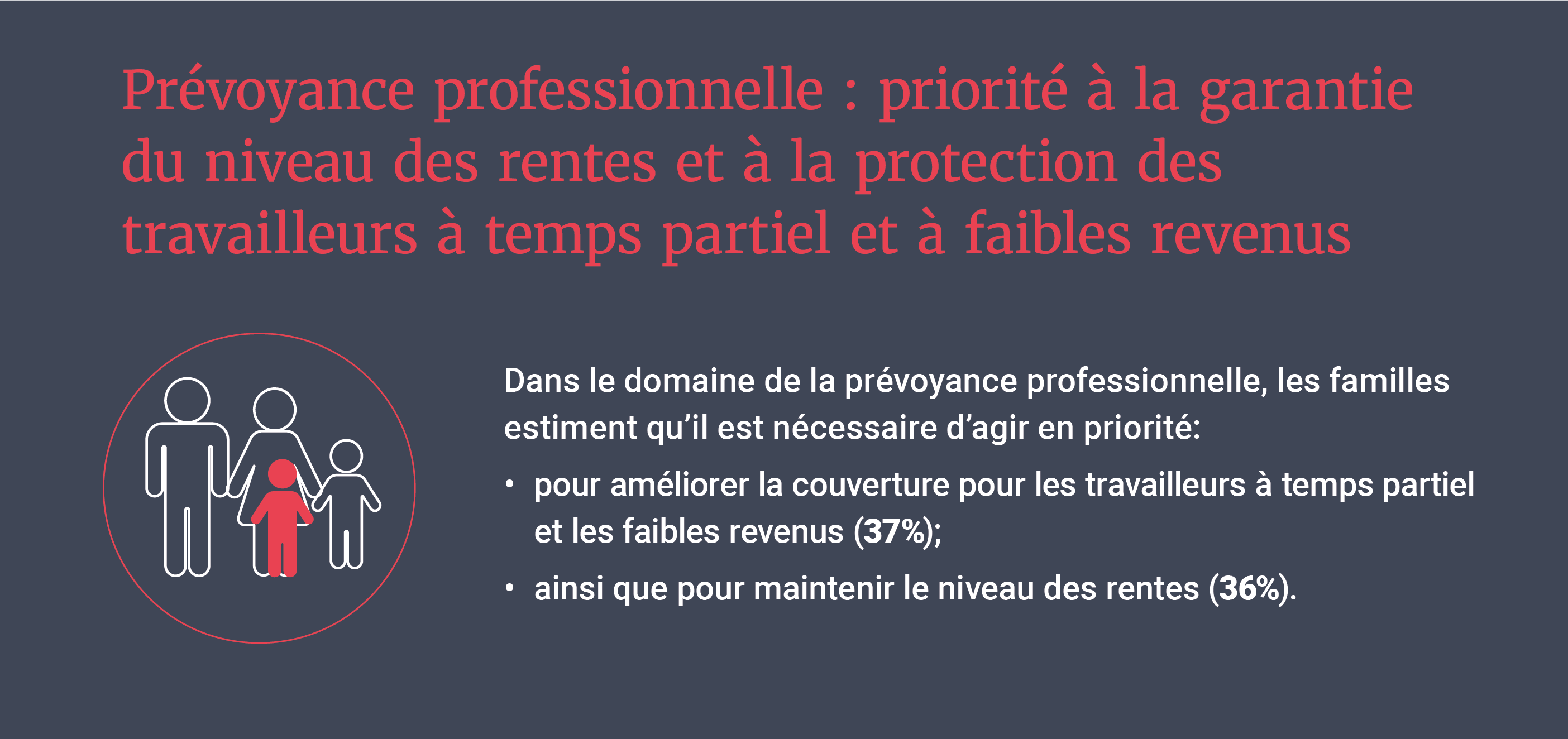 En matière de prévoyance, les familles estiment qu'il est le plus urgent d'agir dans le domaine de la prévoyance professionnelle afin de garantir le niveau des rentes et d'améliorer la protection des travailleurs à temps partiel et des bas salaires. La réduction de la redistribution des actifs des travailleurs vers les bénéficiaires de rentes est jugée moins urgente. L’AVS demeure le pilier central de la prévoyance vieillesse pour les familles, suivie par la prévoyance professionnelle et les économies du pilier 3a. Cependant, pour les ménages dont le revenu brut dépasse 100’000 CHF, la prévoyance professionnelle prend la première place, devant l'AVS.