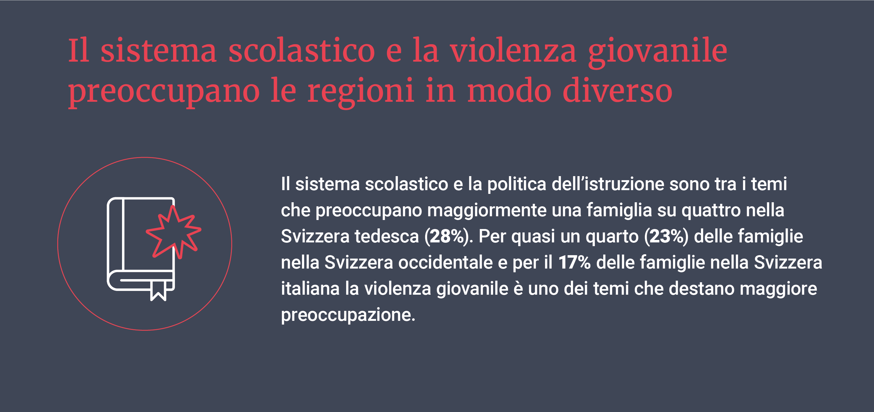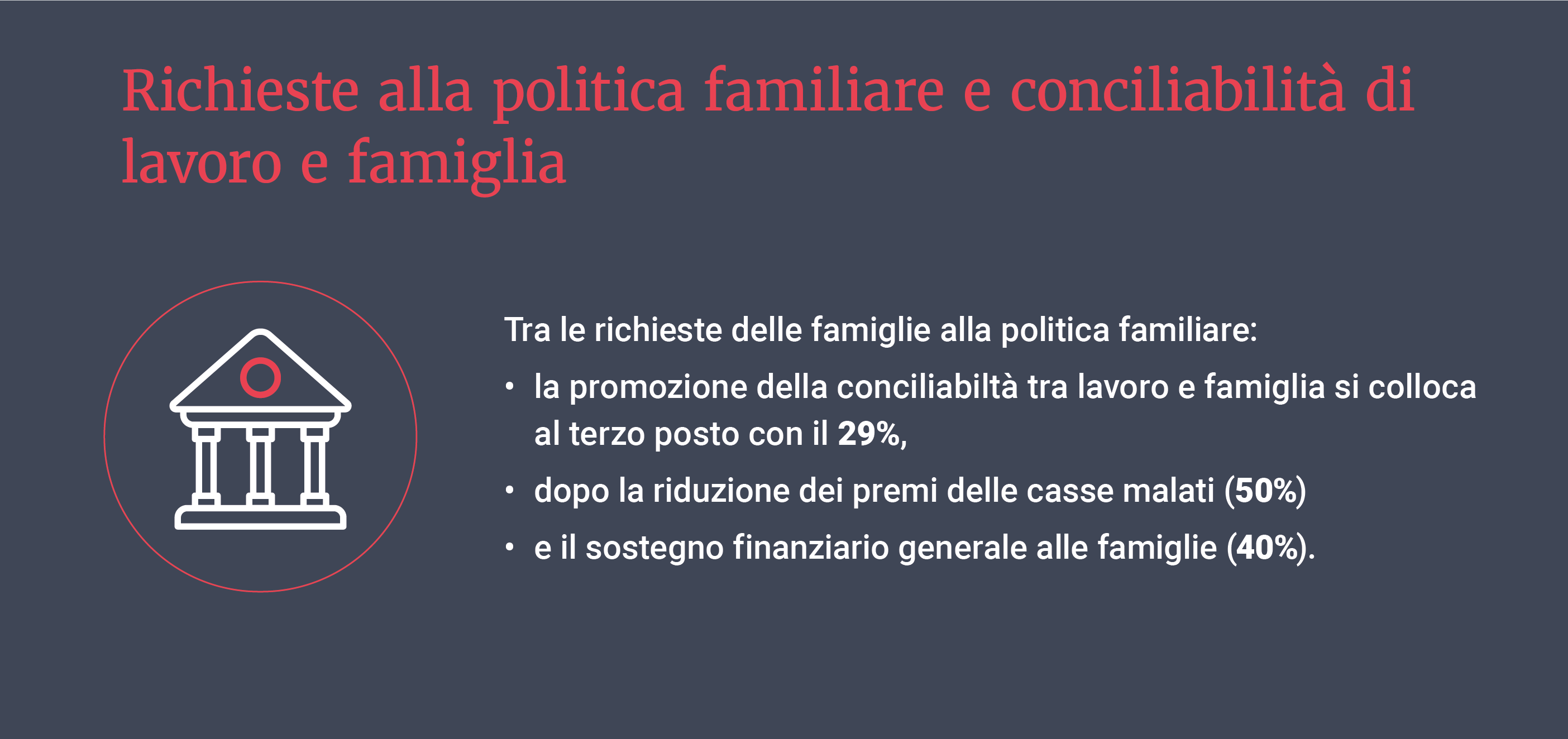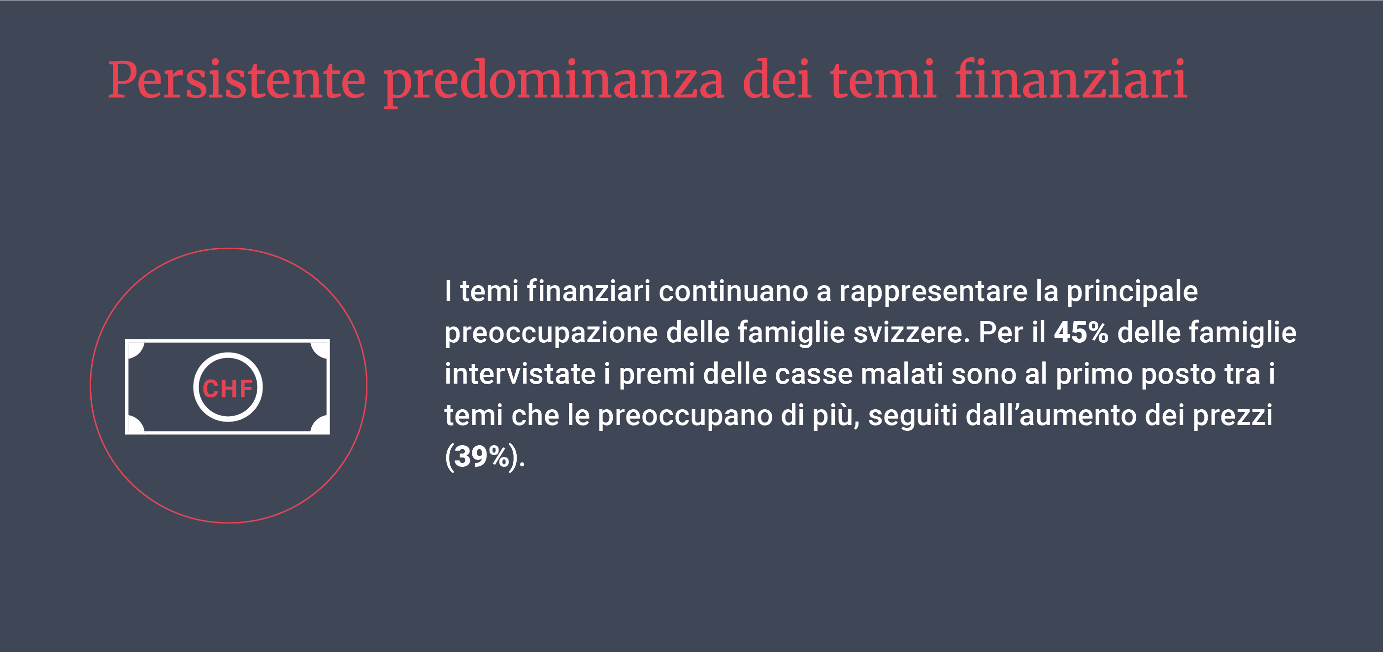 «Il barometro svizzero delle famiglie viene utilizzato una volta all’anno per determinare quali sono i temi che preoccupano maggiormente le famiglie in Svizzera. Essendo un sondaggio ricorrente, rappresenta un’autovalutazione delle famiglie sulla loro percezione della realtà della vita, e questa percezione è ciò che, in ultima analisi, influenza i loro atteggiamenti e le loro azioni.»